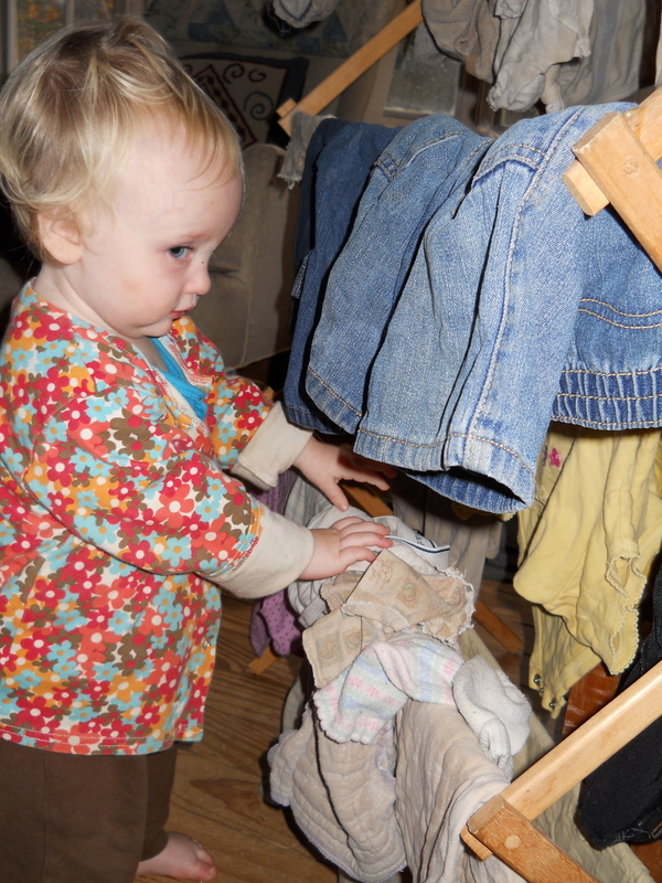 I can get very distracted and yearn for new things for Emmy when I look through some beautiful toy catalogs like Nova Natural or see some beautiful handmade toys in Etsy shops, for example.  But unless it is really, really necessary, or super special, or something that can become an heirloom, we don't buy new for the littlest in our home.  We have a wooden play kitchen that we purchased 10 years ago and it has been used for each child since.  Otherwise, toys consist of the ones we make, or find at yard sales and thrift shops.   She is very happy with a child size broom in one hand a paintbrush in the other.
